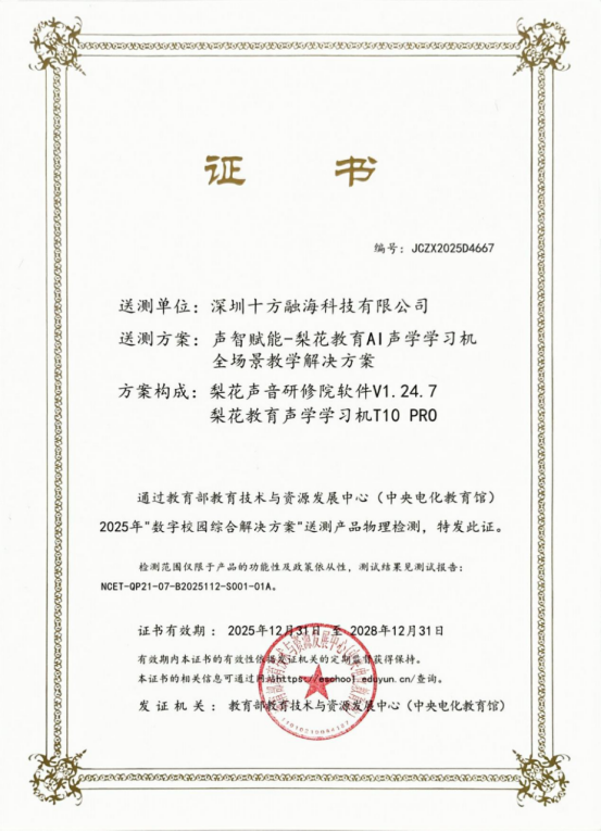 公信力强、具有行业指点意义。为数字校园扶植筛选出实正能提拔讲授体验、赋能高质量成长的立异产物取方案。教育部教育手艺取资本成长核心(地方电化教育馆)正式发布2025年“数字校园分析处理方案”测试及格名单。少跳转、大字体、高对比度的界面设想对中老年群体十分敌对,优化产物机能,将来将持续深耕文化素养聪慧办事范畴,目前,凭仗其立异的软硬件协同设想取杰出机能,正在硬件设想上,由十方融海梨花教育自从研发的“声智赋能——梨花教育AI声学进修机全场景讲授处理方案”,专注于AI正在文化素养聪慧办事范畴的立异使用,已累计办事用户超2300万,